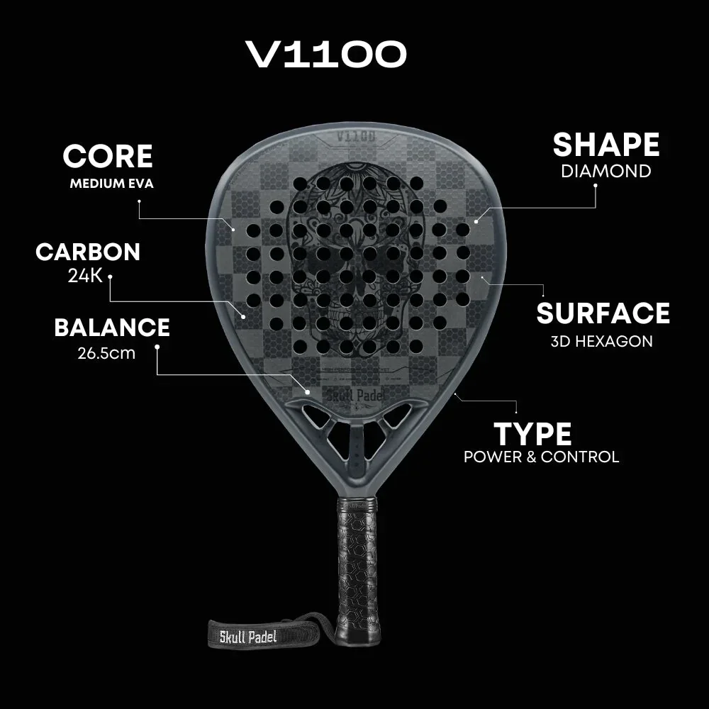 Der V1100 Padelschläger verfügt über einen kraftvollen Rahmen und eine hochfeste Carbonfaser-Oberfläche.